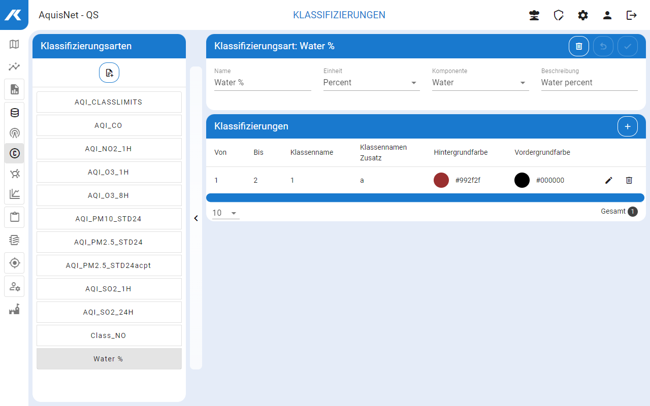 Unter dem Link Datenverwaltung > Klassifizierungen können Sie Messwerte aus Zeitreihen zu Qualitätsstufen (sehr gut, gut, etc.) zuordnen. Dabei werden die Messwerte gegen die Grenzwerte einer Qualitätsstufe überprüft und entsprechend klassifiziert.